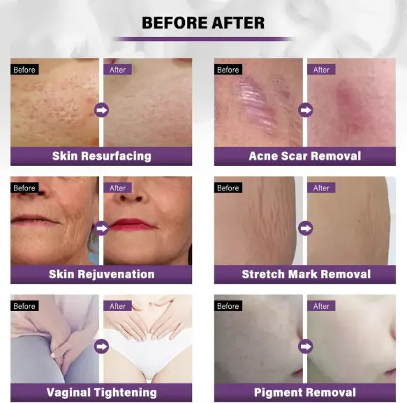3. Suunniteltu liikkuvuudelle, tämä laser mahdollistaa tehokkaat pisteen kohtelut aurinkovaurioista, ikääntymismerkeistä ja aknearvoista. Murto -tekniikka varmistaa turvallisuuden säilyttämällä ympäröivä kudos. Se tuo tehokkaan, klinikan tason ihon nuorentamisen kannettavaan muotoon.